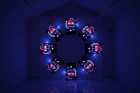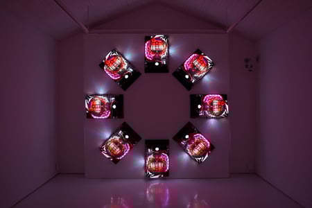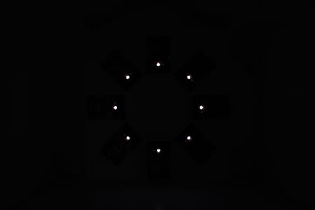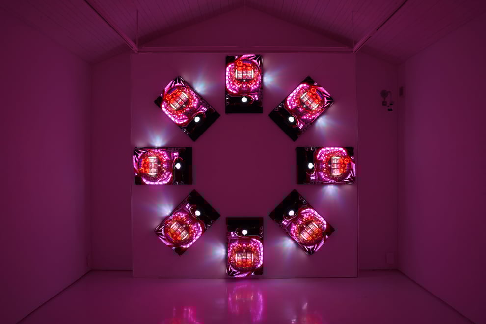 この作品は、実際にパチンコホールで使われていた中古のパチンコ台を8台購入し、円環状に配列した作品である。電気を通すと煌びやかなネオンが動き出し、あたかも独自のプログラムを配したように8台の動作がリンクする。我々が一般的にイメージするパチンコ台が整然と並ぶ雰囲気とはまた違う美の世界へと誘う装置。