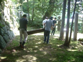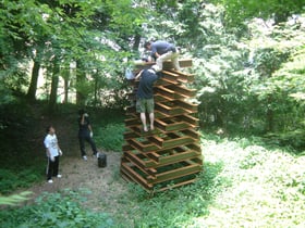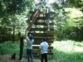 This was an installation utilizing a dead space on the precincts of the Tamatsukuriyu Shrine. The work was inspired by my idea to create a sculpture at this place that no heavy machinery or truck can enter, right next to the groundsill of a shrine built on stone steps that must have been piled up in a great labor mobilization effort centuries ago. With that key concept of “labor mobilization” in mind, I drummed up as many people as I could, who helped assemble the work by carrying iron H-beams one by one up and down the stone steps, and eventually piled them up to create a tower structure. During that operation, I kept reflecting on the necessity and efficiency of construction methods that have been employed since ancient times. As also the title “Labor Mobilization” suggests, the project was not so much about the object itself that eventually emerged, but more about the process of creating it.