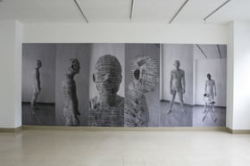 小泉八雲の怪奇文学作品集「怪談(KWAIDAN)」の中にある「耳なし芳一の話」の象徴的な場面(お経を耳だけ書き忘れた)に着想を得て制作。「怪談(KWAIDAN)」とは、小泉八雲が妻である小泉せつから聞いた数々の怖い話をもとに自分なりの解釈を交えて書き下ろした再話本である。洋書の「耳なし芳一の話」のコピーテキストを耳だけ残して藤原の全身に貼っていき、貼り終えるとまた剥ぎとり壁に貼った。「耳なし芳一の話」を藤原というフィルターを通過させ、藤原なりの解釈を交えて再々話(テキストではなく彫刻として)し、怪談の醍醐味の一つである人間の不在を表現した。